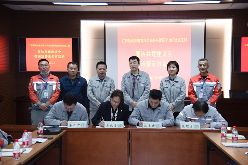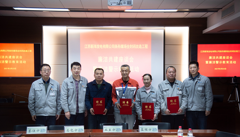 近日,新电公司举办了条形煤场全封闭改造工程廉洁共建座谈会暨廉洁警示教育活动。该工程业主方、总包方和监理方代表在新电公司纪委的见证下,共同签署了以工程各方廉洁从业负面清单为主要内容的廉洁共建协议书,并在参建各方择优选聘了4名廉洁监督员。