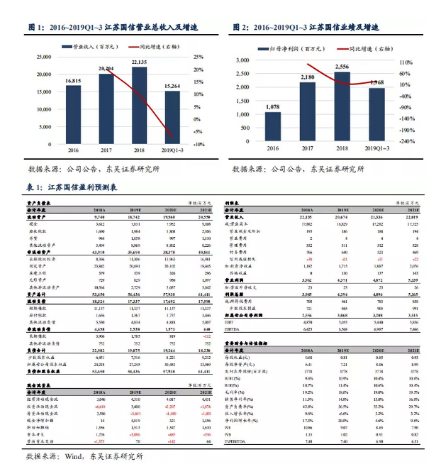 1)公司2019Q1~3实现归母净利润同比+24.3%至19.7亿元,主要系对利安人寿以及对联营企业江苏银行按权益法核算,致投资收益同比+106%至17.8亿元。2)信托业务贡献公司主要利润(2019H1占营业利润85.4%),2019Q1~3实现手续费及佣金收入同比+16.0%至8.2亿元,得益于公司主动优化业务结构,压缩通道的同时提升主动管理能力以提升信托报酬率。3)江苏信托先后投资了江苏银行、利安人寿等多家优质金融企业,投资效益显著。此外,公司财富团队搭建完成,北京、上海等地建立区域总部拓展省外市场,并持续完善市场化人才机制和加强产品直销能力,信托业绩增长可期。